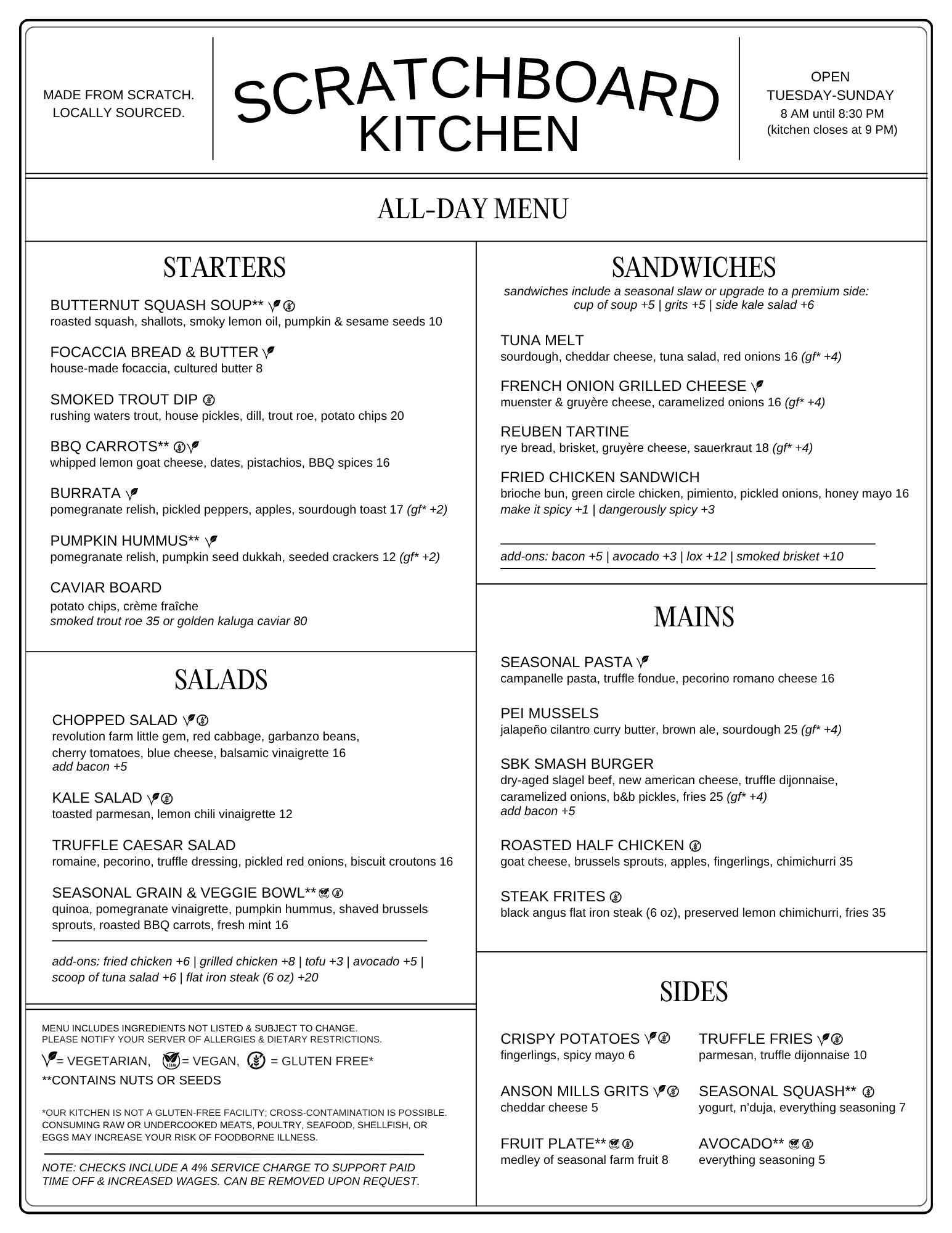 Tuesday – Sunday: 8 AM to 8:30 PM (kitchen closes at 9 PM)